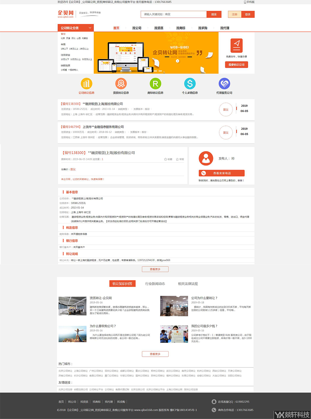 企貝網站是由專業的鄭州網站建設公司燚軒科技定制制作的,網站主要是為用戶提供公司、商標、資質的轉讓,以及求購、求代理的信息。可以更加快速的幫助用戶解決這方面的問題。更快速的促成買賣雙方的合作,實現信息的快速流通。