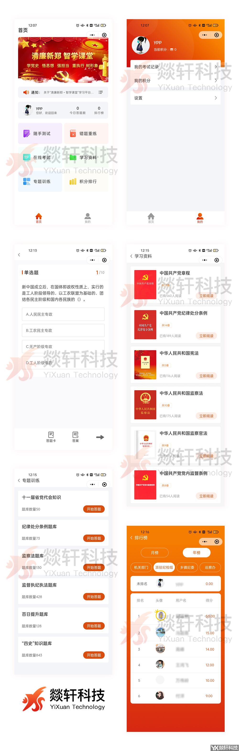 功能:學習黨政知識、隨手測試、在線考試、專題訓練、積分排行榜等